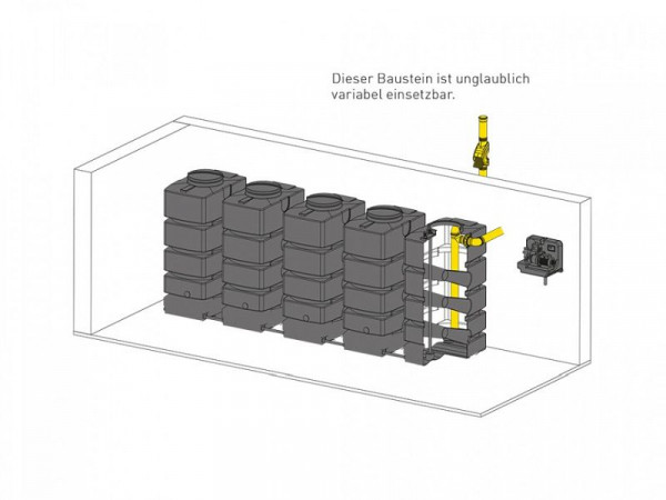 - Erweiterbar zur Speicherbatterie: Über einen integrierten Verbindungsstutzen können mehrere Kellertanks hydraulisch zusammengeschaltet werden – längs oder quer angeordnet, mit einem Mindestabstand von 10 cm zwischen den Behältern.