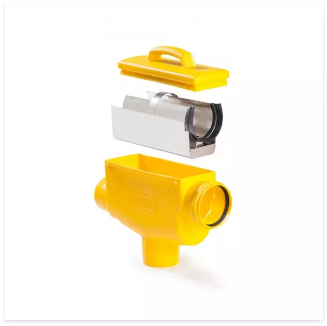 The LineAr 100 rainwater filter made of plastic has a vertical filter mesh made of stainless steel with a mesh size of 0.44 mm. The filter body is made of polyethylene (PE) and all connections have a diameter of DN 110. The filter can be installed either in the dome shaft of a cistern or in a separate shaft and complies with the requirements of DIN 1986. A cleaning brush is included in the scope of delivery.