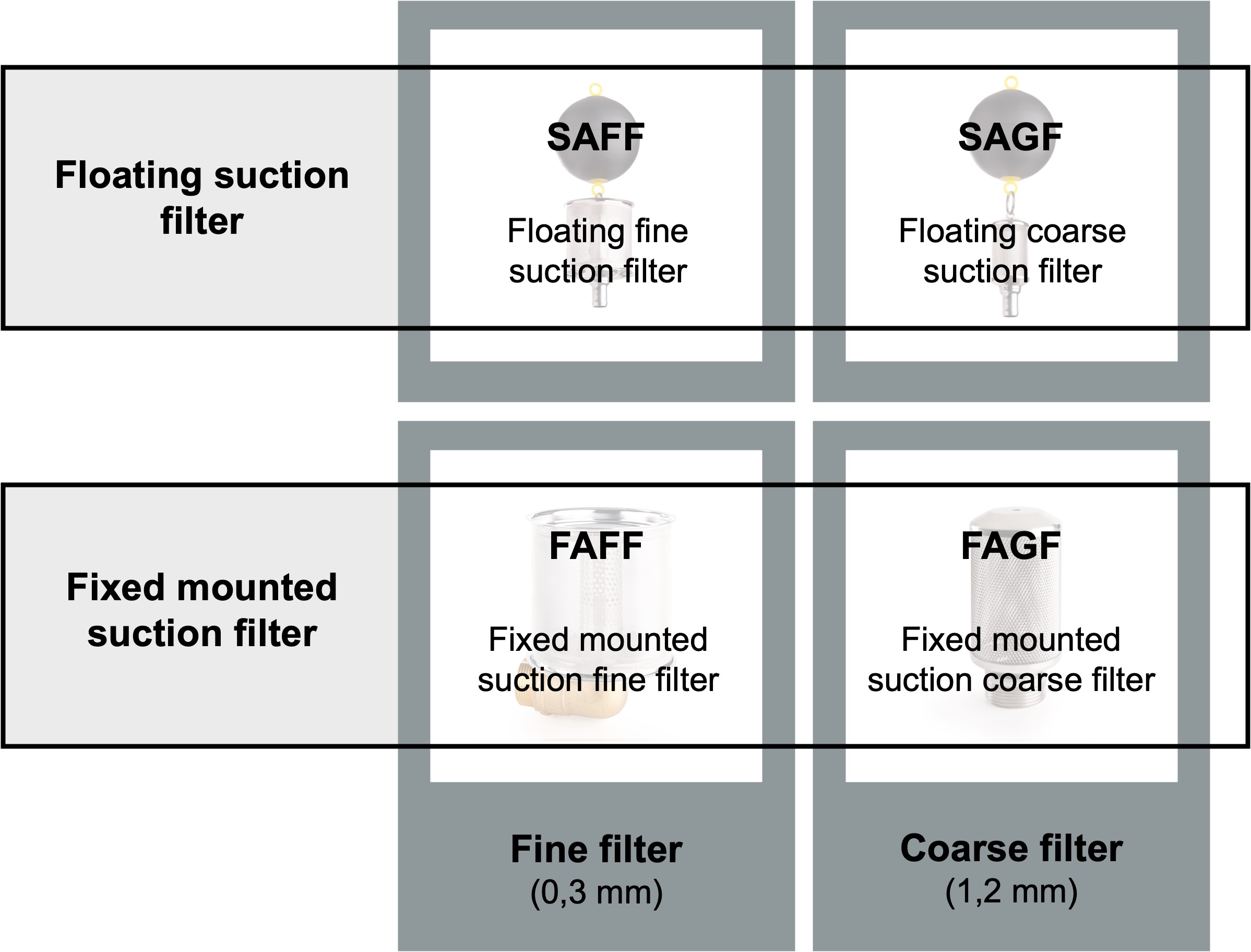 Suction filter for fixed mounting on submersible pressure pumps | Fine filter (FAFF with 0.3 mm mesh) | Coarse filter (FAGF with 1.2 mm mesh) |