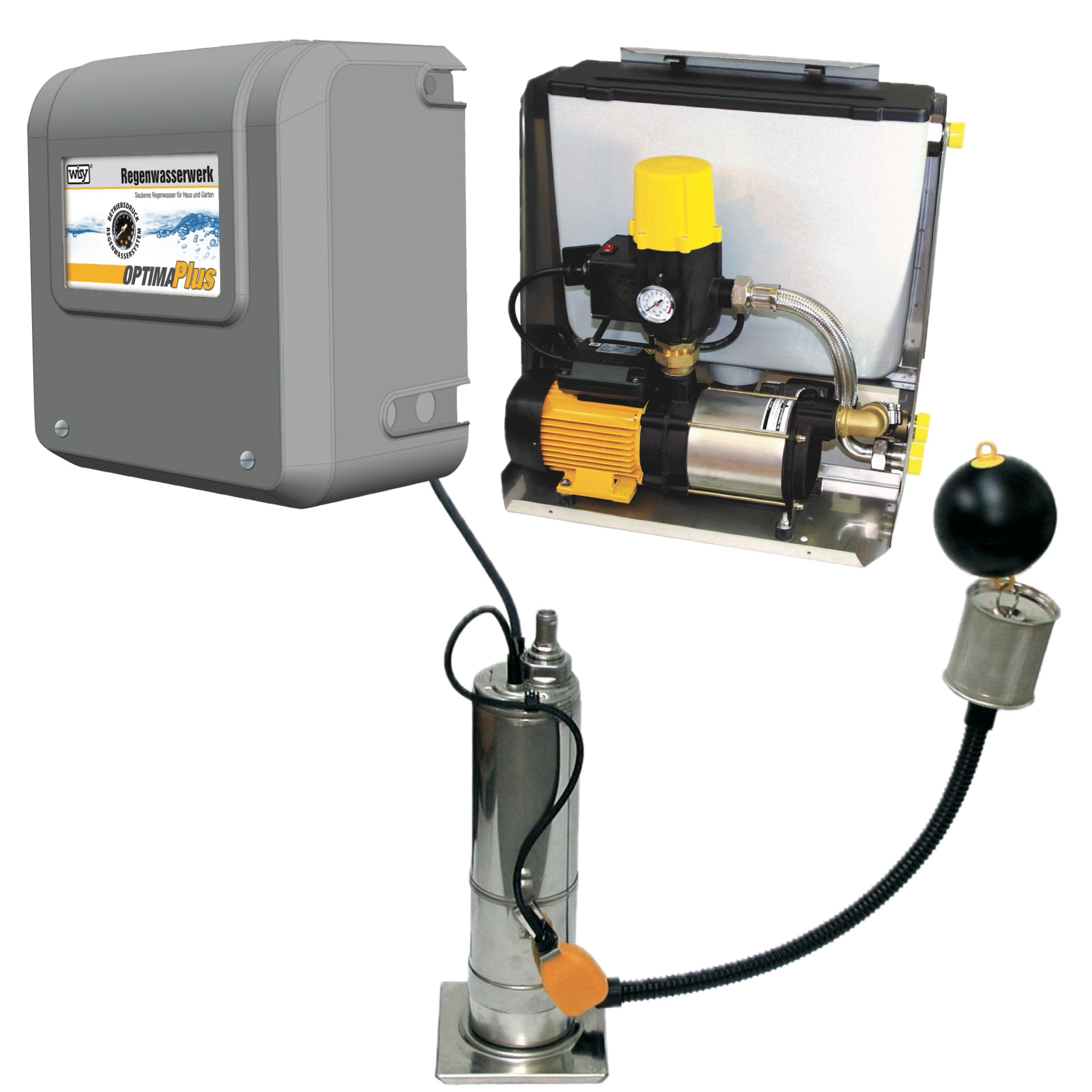 Im Wandgerät ist eine zweite Druckpumpe integriert, die das bereitgestellte Wasser – entweder Regenwasser aus der Zisterne oder bei Bedarf städtisches Leitungswasser – mit konstantem Druck zu den Verbrauchern fördert. Durch diese Aufteilung der Förderaufgaben und die Redundanz der Pumpen arbeitet das Optima als Regenwasser-Hauswasserwerk besonders stabil und eignet sich für Anwendungen mit erhöhten Anforderungen an Komfort und Druckkonstanz.