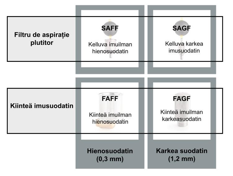 | Kelluvat imusuodattimet imupumppuihin, joissa on takaiskuventtiili | Hienosuodatin (SAFF, jonka silmäkoko on 0,3 mm) | Karkeasuodatin (SAGF, silmäkoko 1,2 mm) |