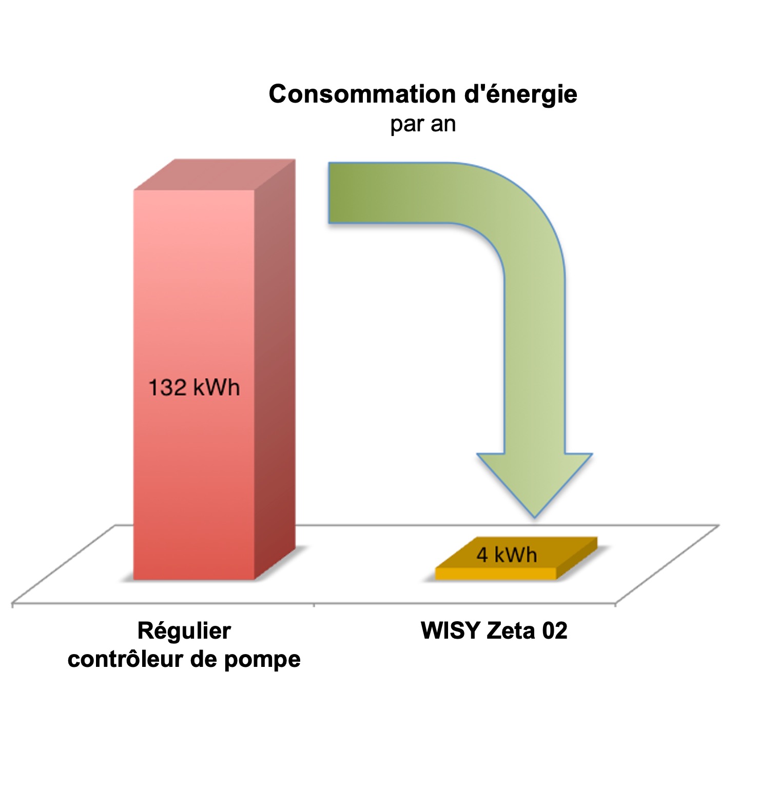 Grâce au nouveau circuit électronique, la consommation de courant en mode stand-by est réduite à 0,2 watt, alors que les commutateurs automatiques usuels tirent une puissance entre 6 et 15 watts du réseau. Ainsi, le ZETA 02 de WISY permet d'économiser jusqu'à 128 kWh par an. Cela s'accompagne d'une réduction de 97% des émissions de CO₂, soit 70 kg par an.