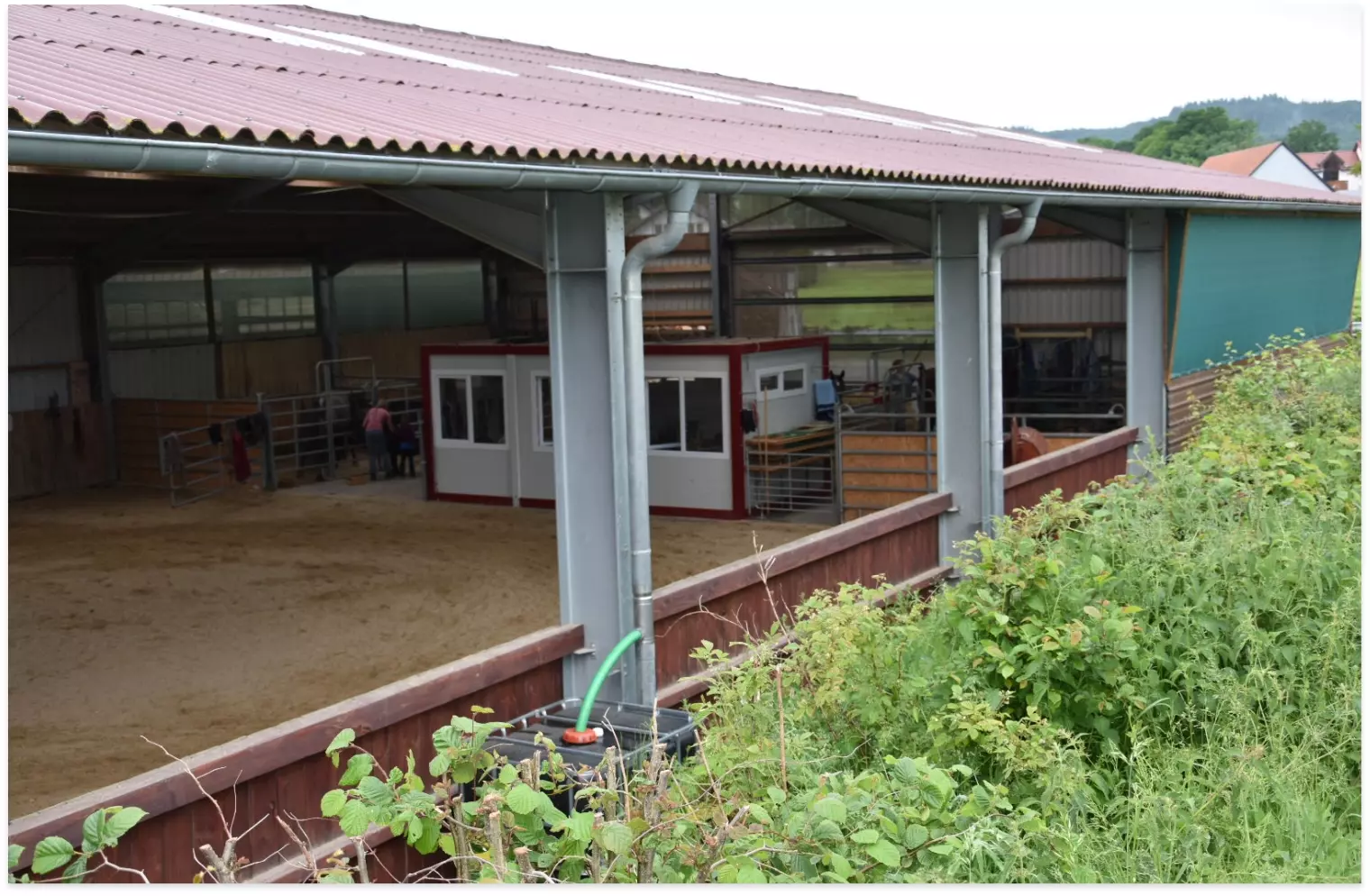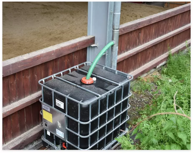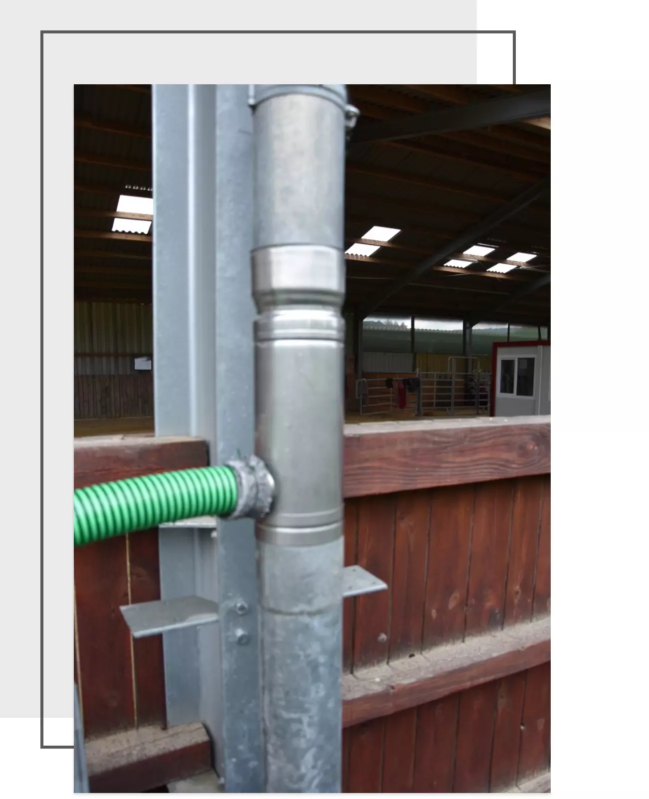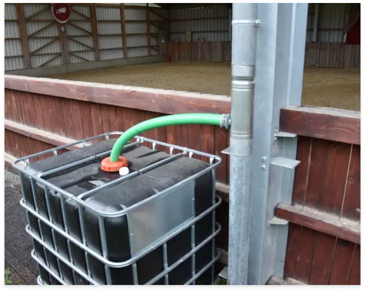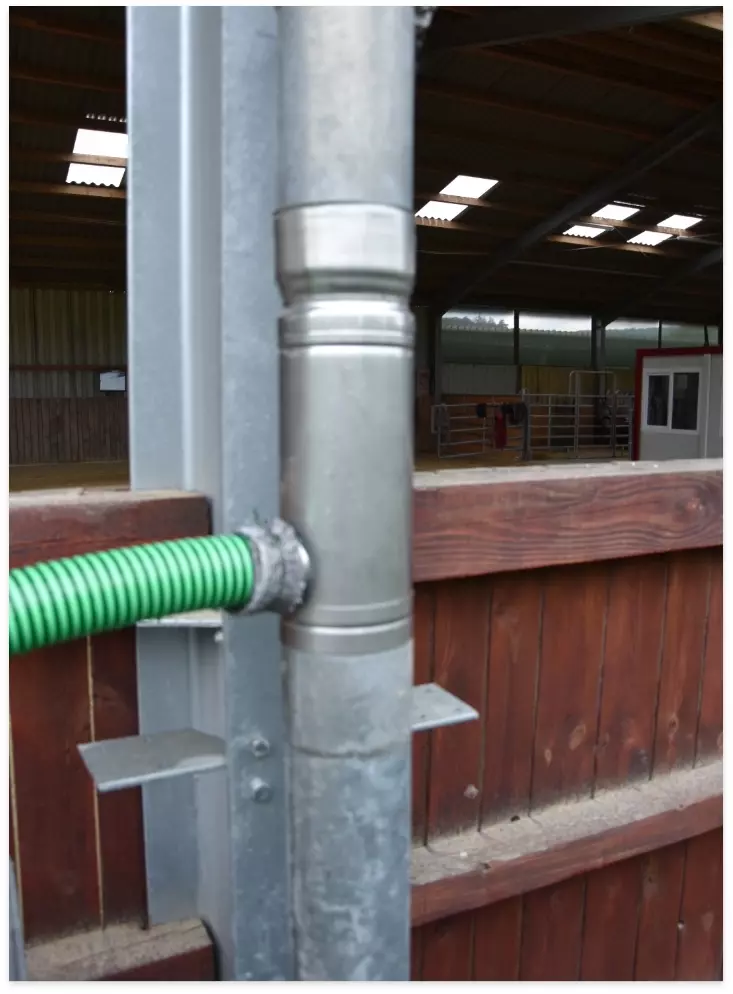 2 συλλέκτες φίλτρων FS εγκαταστάθηκαν σε έναν κλειστό στίβο ιππασίας στο Bischoffen της Αλσατίας. Η διάμετρος του καταθλιπτικού σωλήνα των 120 mm είναι ένα ιδιαίτερο χαρακτηριστικό εδώ. Οι συλλέκτες φίλτρων εγκαθίστανται στον καταθλιπτικό αγωγό με έναν μικρό πρόσθετο σφιγκτήρα σύνδεσης. Ο καθένας τους γεμίζει ένα πλαστικό δοχείο IBC με βρόχινο νερό που χρησιμοποιείται για το πότισμα της επιφάνειας ιππασίας.