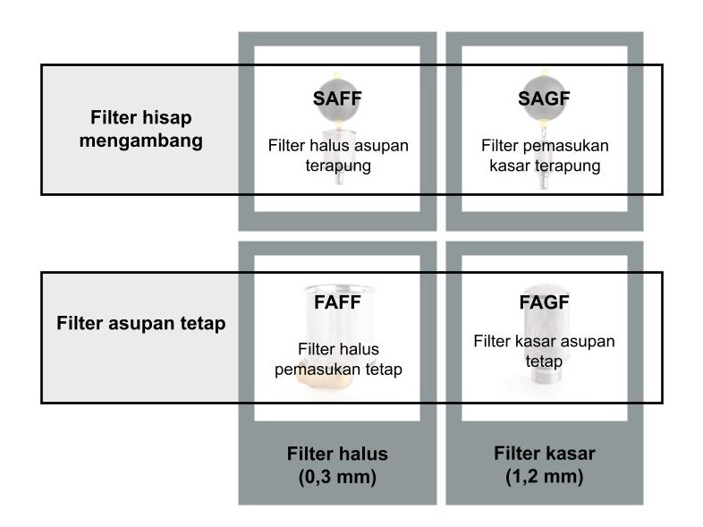 Filter pemasukan tetap terhubung langsung ke pompa submersible tanpa selang penghubung dan bola apung. Filter ini tersedia dengan jaring filter kasar atau halus.