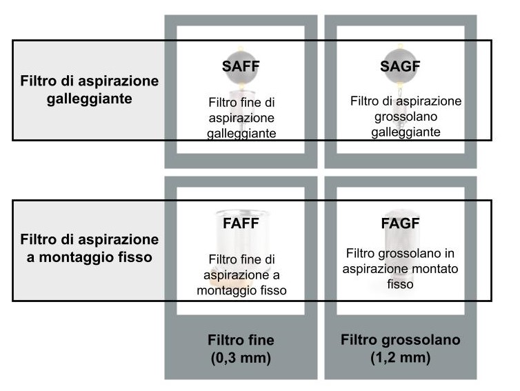 | Filtro di aspirazione per installazione fissa su pompe a pressione subacquee | Filtro fine (FAFF con maglia da 0,3 mm) | Filtro grossolano (FAGF con maglia da 1,2 mm) |