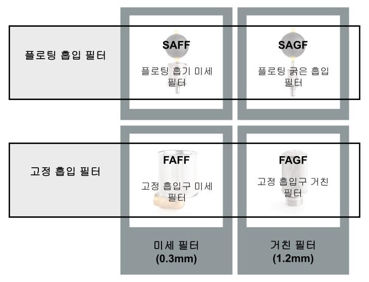 | 수중 압력 펌프에 고정 설치하기 위한 흡입 필터 | 미세 필터(0.3mm 메시 크기의 FAFF) | 거친 필터(1.2mm 메시 크기의 FAGF) |