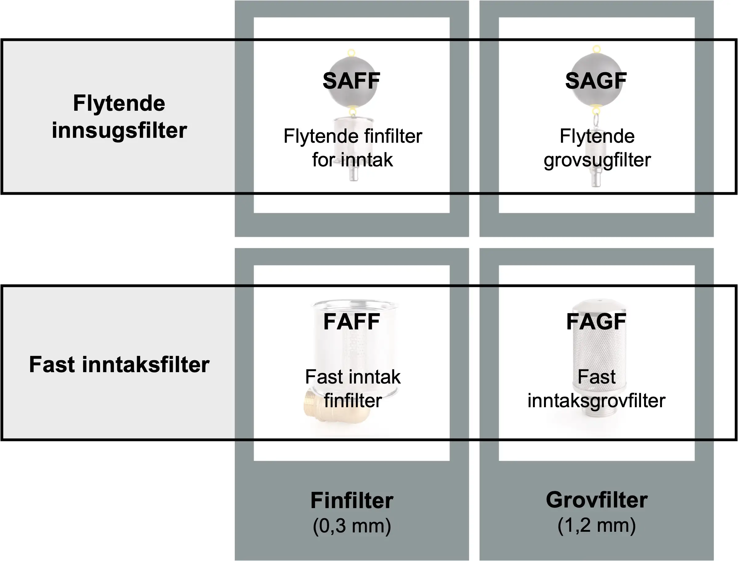 | Sugefilter for fast montering på undervannstrykkpumper | Finfilter (FAFF med 0,3 mm maskevidde) | Grovfilter (FAGF med 1,2 mm maskevidde) |