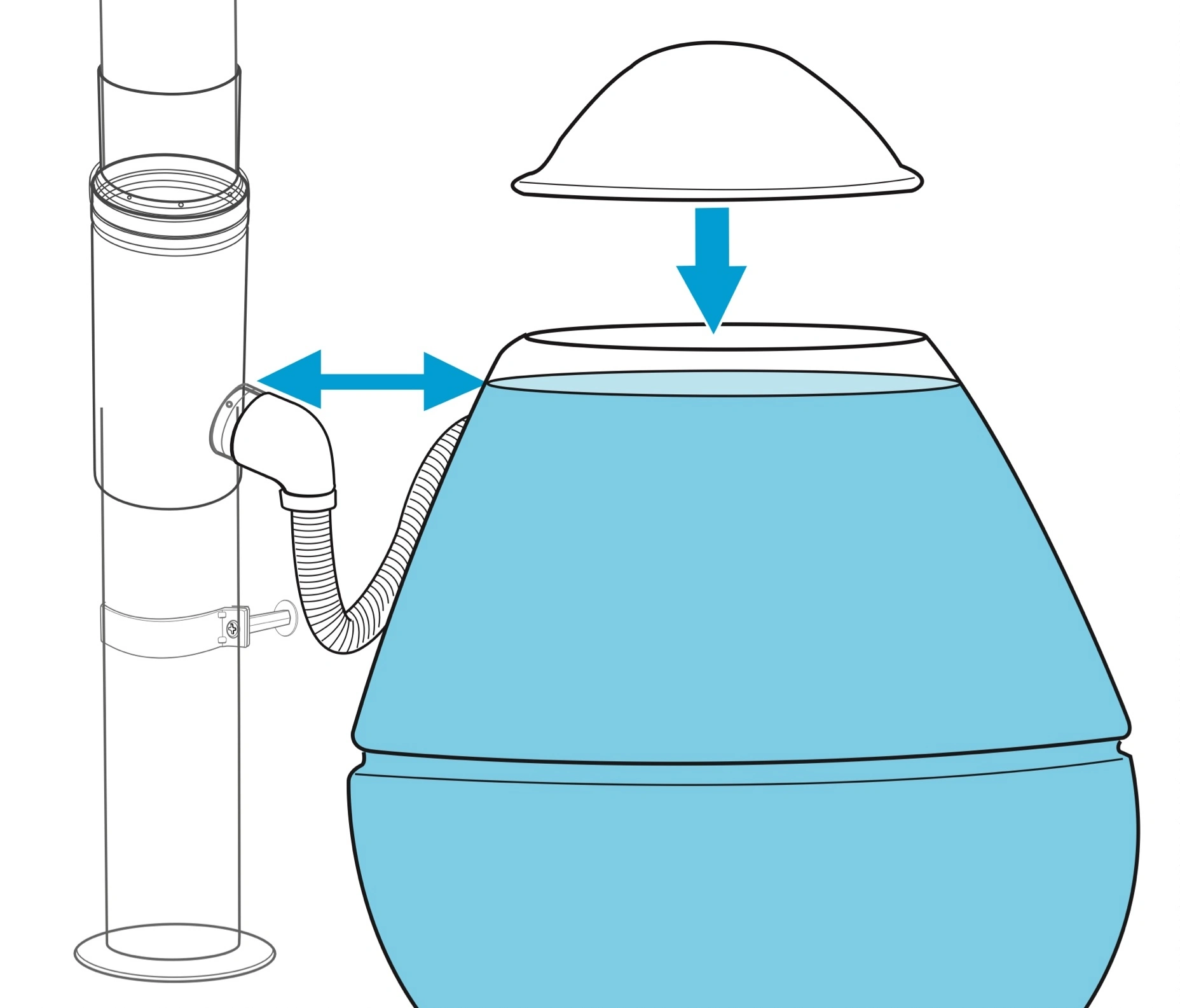Jeśli beczka na deszczówkę jest pełna, woda jest kierowana w dół w prawidłowo zainstalowanym filtrze rury spustowej, dzięki czemu beczka nie może się przelać. Jednak zarówno w przypadku klapy przeciwdeszczowej, jak i separatora liści, pełna beczka na deszczówkę przeleje się, ponieważ nie ma hydraulicznego sprzężenia poziomu wody między zbiornikiem wody deszczowej a rurą spustową.
