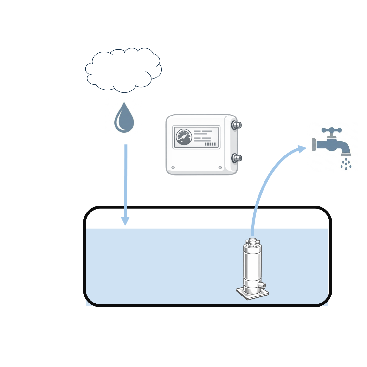 Ein Regenwasserwerk fördert das Wasser aus der Zisterne, baut den erforderlichen Leitungsdruck für die Verbraucher auf und schaltet bei Bedarf automatisch auf die öffentlich Wasserversorgung um. Sobald eine Entnahmestelle geöffnet wird, erkennt die Steuerung den Druckabfall und startet die Pumpe. Sind alle Entnahmestellen geschlossen, stellt das System den gestoppten Durchfluss fest und beendet den Pumpenbetrieb, um Energie zu sparen.