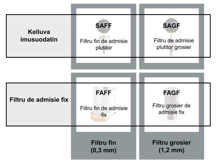 | Filtru de aspirație pentru instalare fixă la pompele subacvatice sub presiune | Filtru fin (FAFF cu ochiuri de 0,3 mm) | Filtru grosier (FAGF cu ochiuri de 1,2 mm) |