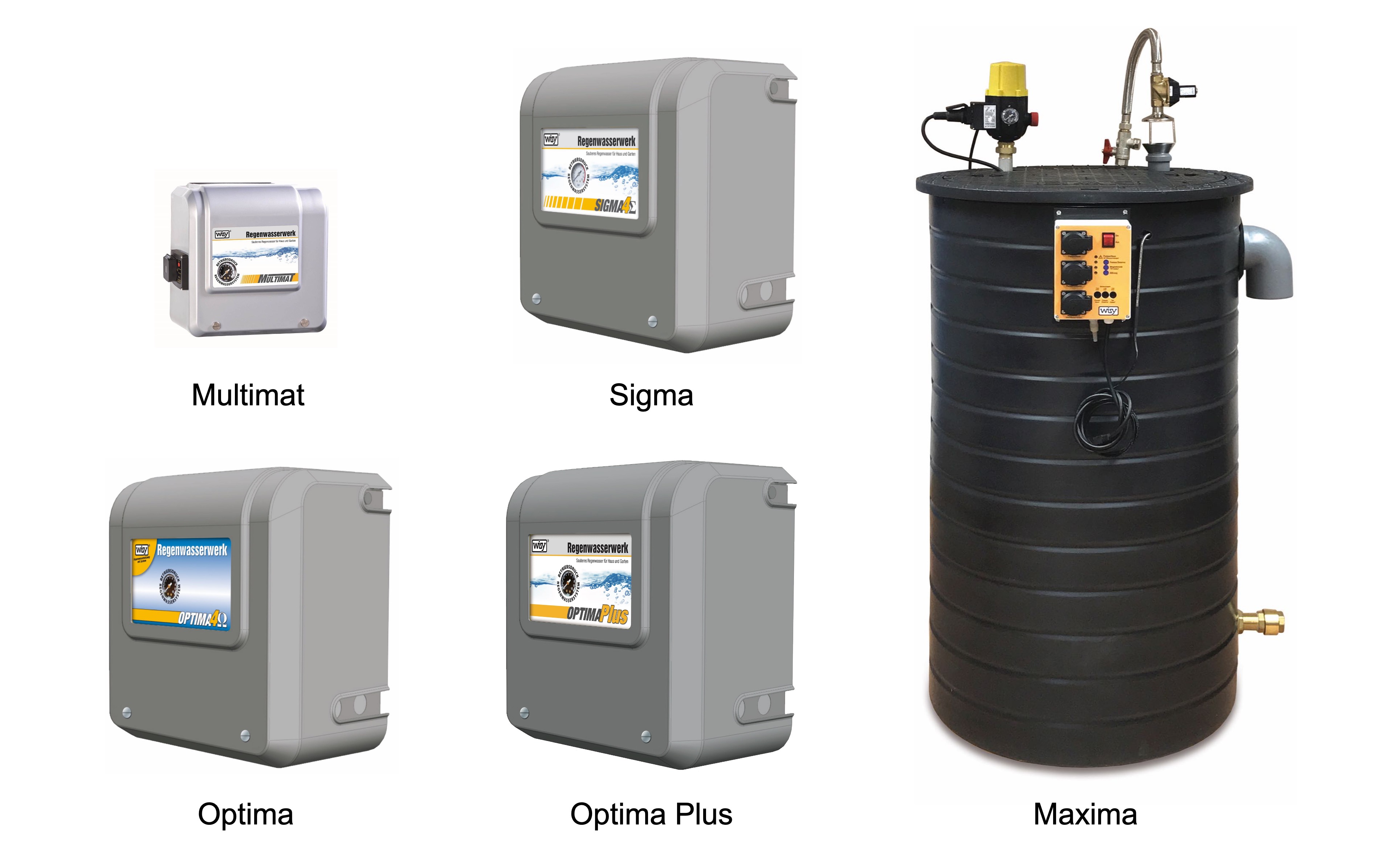 WISY предлагает водосточные установки, которые перекачивают дождевую воду непосредственно из цистерны с помощью погружного напорного насоса (Multimat) или в которых самовсасывающий насос установлен в настенном блоке (Sigma). Для больших расстояний и перепадов высот предлагаются комбинированные варианты (Optima и Optima Plus). Если требуется особенно высокая производительность, используется дождеприемник Maxima, который в зависимости от варианта исполнения может снабжать до восьми домов, а также применяется в промышленности и торговле.