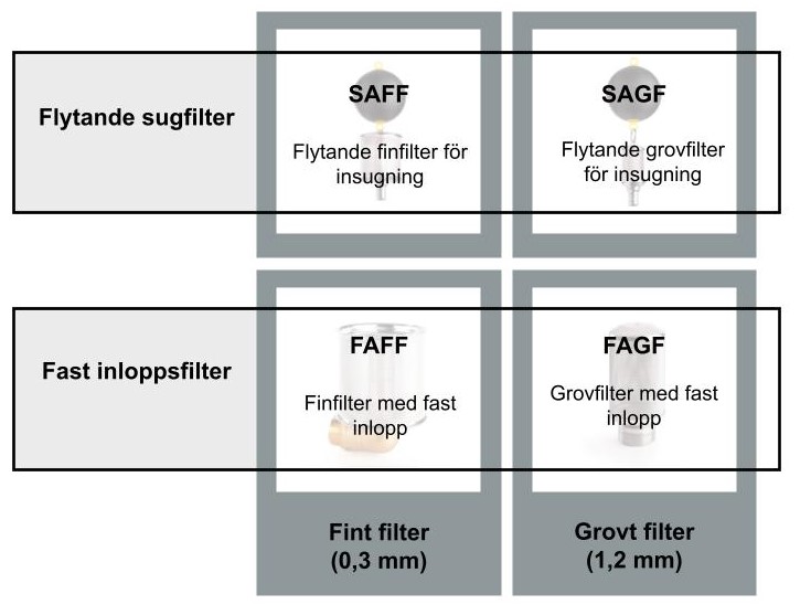 Fasta insugningsfilter ansluts direkt till den dränkbara pumpen utan anslutningsslang och flytande kula. De finns med grovt eller fint filternät.