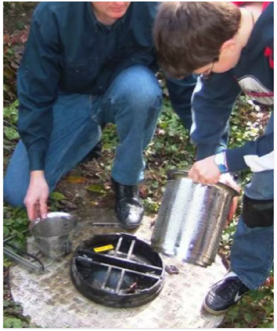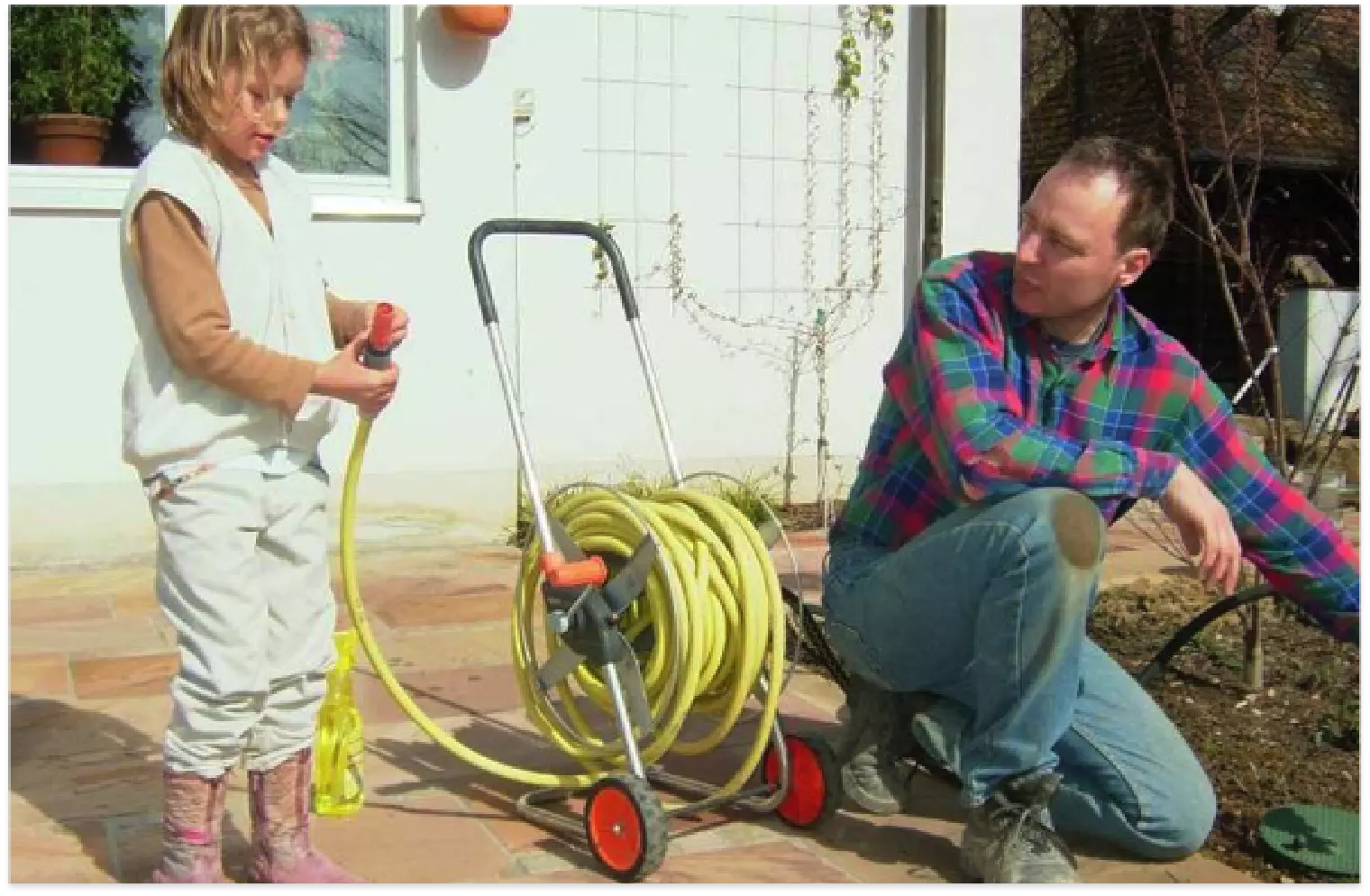 Dotter Lisa övar på att använda slangupprullaren för att vattna trädgården. Slangen är ansluten till regnvattensystemets tryckrör i ett underjordiskt "uttag". Familjen Kramer använder också det fria vattnet från taket för att spola toaletten och tvättmaskinen, eftersom det mjuka vattnet också sparar tvättmedel. Om regnvattentanken svämmar över sipprar det vatten som fortsätter att rinna in ut i trädgården. På så sätt bildas grundvatten och avloppssystemet avlastas.