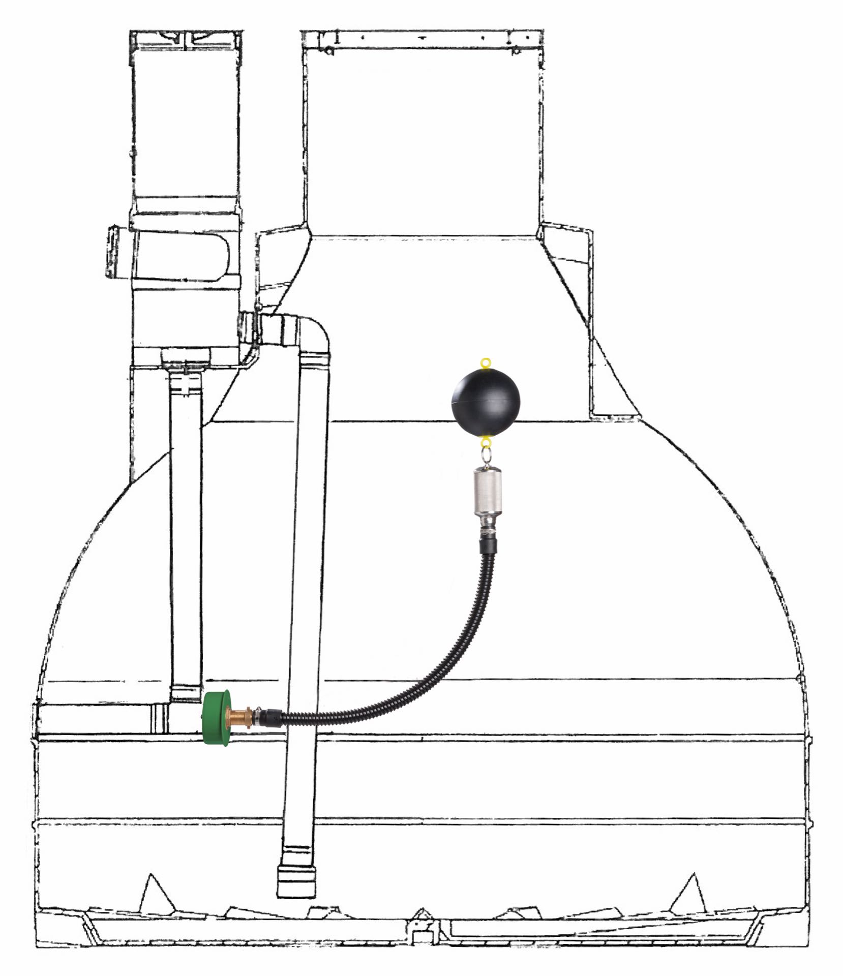Den mycket flexibla anslutningsslangen anpassar sig till den aktuella vattennivån. Den förblir permanent flexibel och inga sprickor uppstår på grund av upp- och nedrörelsen. Avrinningsvattnet leds sedan ut i avloppssystemet via en KG-uttagsplugg DN 110.