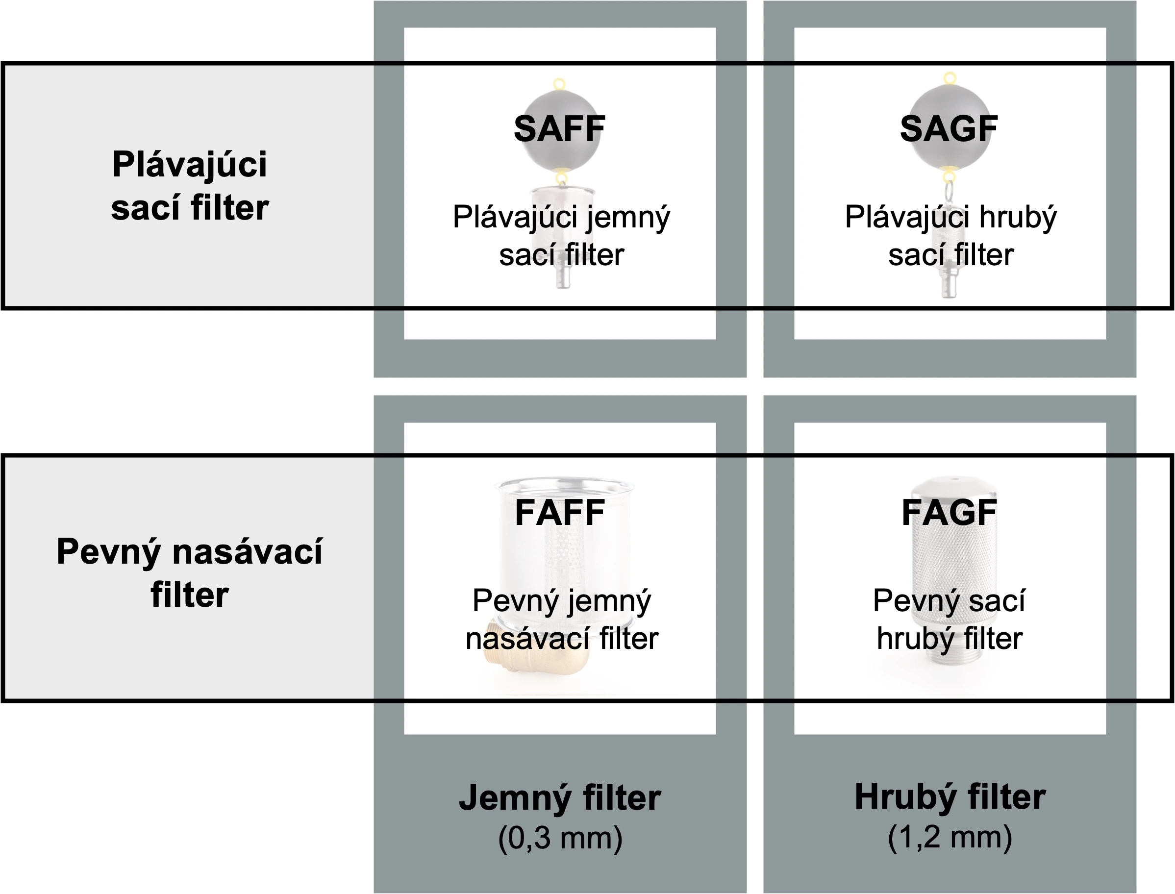 Pevne namontované sacie filtre sú pripojené priamo k ponornému čerpadlu bez spojovacej hadice a plávajúcej gule. Sú k dispozícii s hrubými alebo jemnými filtračnými okami.