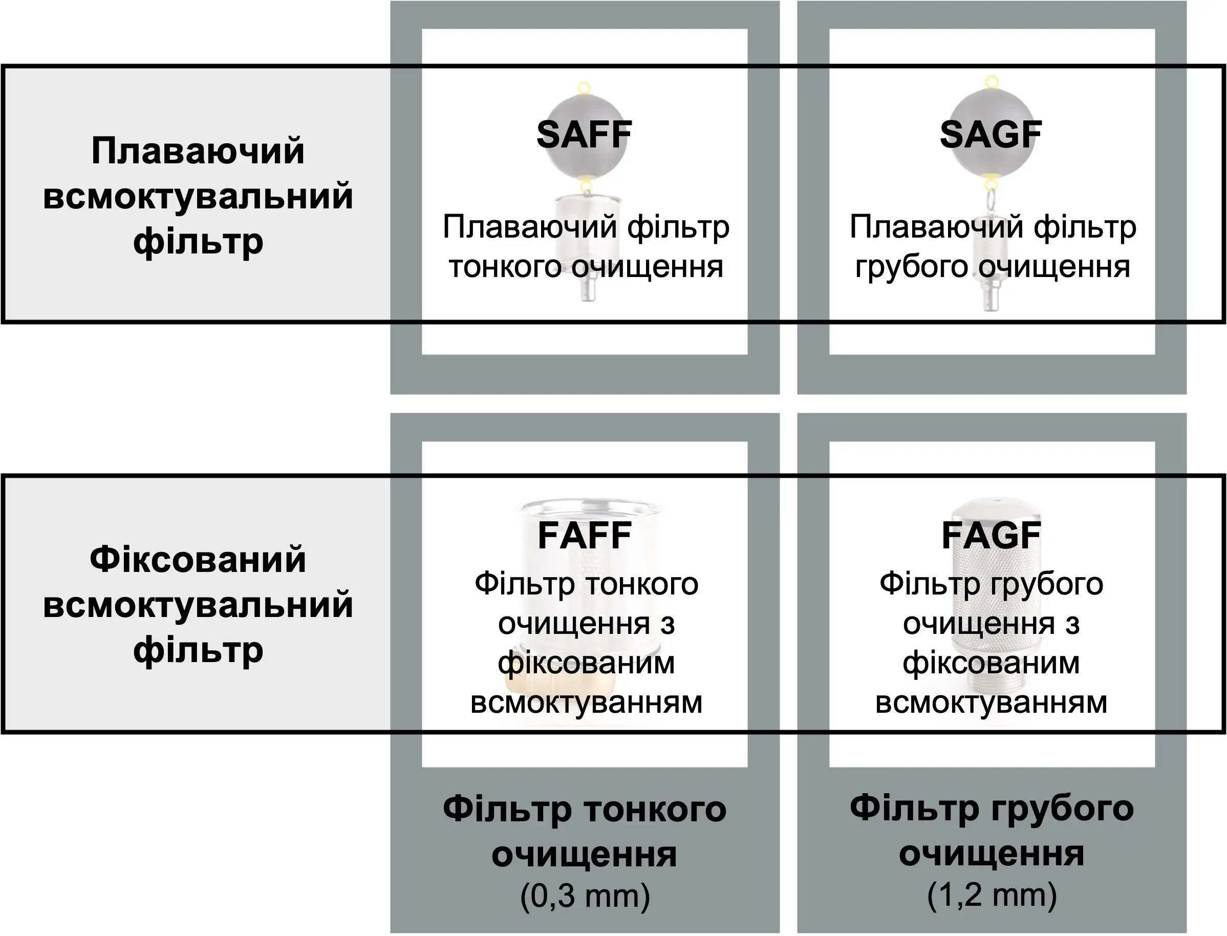 Плаваючі всмоктувальні фільтри для всмоктувальних насосів зі зворотним клапаном | Фільтр тонкого очищення (SAFF з розміром комірок 0,3 мм) | Фільтр грубої очистки (SAGF з розміром комірок 1,2 мм) |