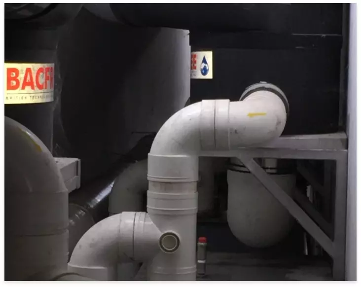 Regenwassser von 9.500 m² Dachfläche wird per Druckentwässerung vom Dach in das 4. Untergeschoß transportiert. Dort wird es von sechs Wirbel Feinfiltern WFF 300 gefiltert und in einem 220 m³ großen unterirdischen Tank gelagert. Genutzt wird es zum Betrieb der Toilettenspülungen und für die Gartenbewässerung. Der Rohrdurchmesser des senkrechten Druckentwässerungsrohres beträgt 100 mm. Er wird in Stufen auf 300 mm vergrößert. Dadurch verringert sich die GEschwindigkeit des vom Dach kommenden Wasser auf ca. 1,5 m pro Sekunde, womit die nachfolgenden Wirbelfilter WFF 300 problemlos betrieben werden können.
